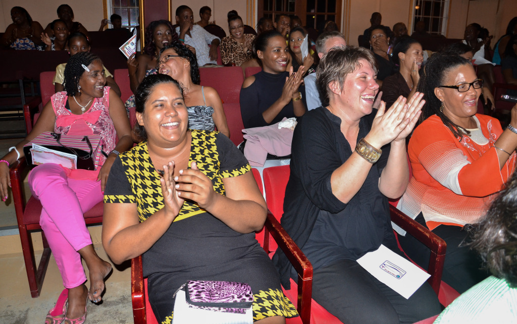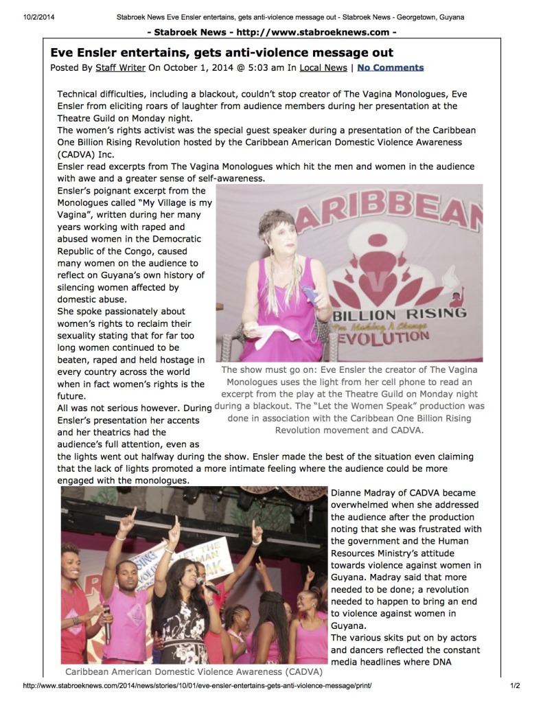 Eve Ensler traveled to Guyana, upon the invitation of OBR Caribbean, as part of her recent One Billion Rising tour to be part of the launch of OBR Guyana: “Guyana’s Revolutionary Transformation: Ignite the Fire Within”. The two day visit began with the panel discussion on the theme: “State of Female Justice in Guyana: Social Justice with Love”. The panel took on a holistic approach as voices were raised. A discussion with a live studio audience with many community women began to look at safeguarding the security of women in Guyana and dialogues were discussed in finding solutions. On the second day a cultural event was hosted by OBR Caribbean called “Let The Women Speak” – featuring artistic performances by Eve Ensler and by amazing local Guyana artists – with grassroots women’s groups and community women in attendance. Despite electricity going off during the event, Eve performed to a highly energised audience, with OBR Caribbean coordinator Dianne Madray doing a call for Revolution at the end of the evening.