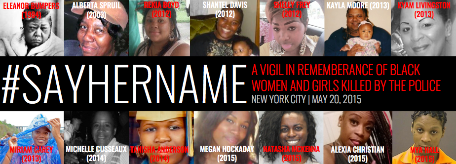 Monday, May 18, 2015 – In order to shed light on Black women’s experiences with police violence, the African American Policy Forum, in partnership with One Billion Rising, BYP100, The Stop Mass Incarceration Network, Black Lives Matter NYC, and many other community organizations will hold #SayHerName: A Vigil in Remembrance of Black Women and Girls Killed by the Police. The vigil is being held on the evening prior to a National Day of Action to End Police Violence Against Black Women, being organized by the Black Youth Project 100.