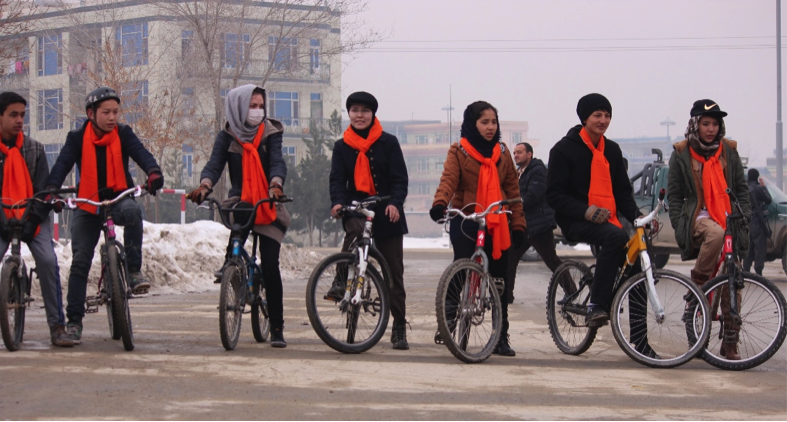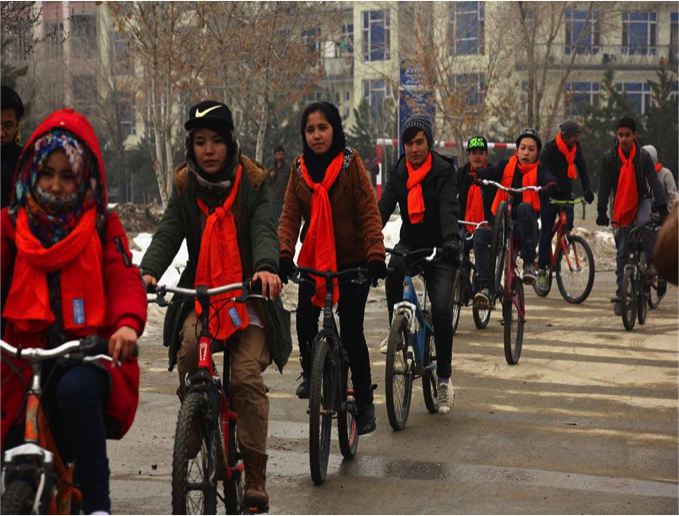 On 14th February, around 400 Risers rose in a square in Kabul, Afghanistan. The event started with a group of school girls reading a poem by Simin Bahbahani about women and distribution of colored umbrellas among participants. An explanation of the overall goal of the campaign and the importance of people’s participation in the struggle for elimination of violence against women was shared. Then, a play was performed on violence against women in Afghan society. This was followed by a rap song by two young boys about the kinds of violations that Afghan girls face and a call to the boys in the audience to check their own behavior and privilege. After this, the audience took a resolution to work on the issue of violence against women and to help to eliminate violence against women in all areas. Ahead of the event, a group of mainly women bicyclists cycled a distance of four to five kilometers wearing orange scarves. Riding a bicycle is considered to be something only men do in Afghanistan.