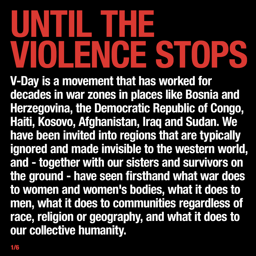V-Day is a movement that has worked for decades in war zones in places like Bosnia and Herzegovina, the Democratic Republic of Congo, Haiti, Kosovo, Afghanistan, Iraq and Sudan. We have been invited into regions that are typically ignored and made invisible to the western world, and – together with our sisters and survivors on the ground – have seen firsthand what war does to women and women’s bodies, what it does to men, what it does to communities regardless of race, religion or geography, and what it does to our collective humanity.