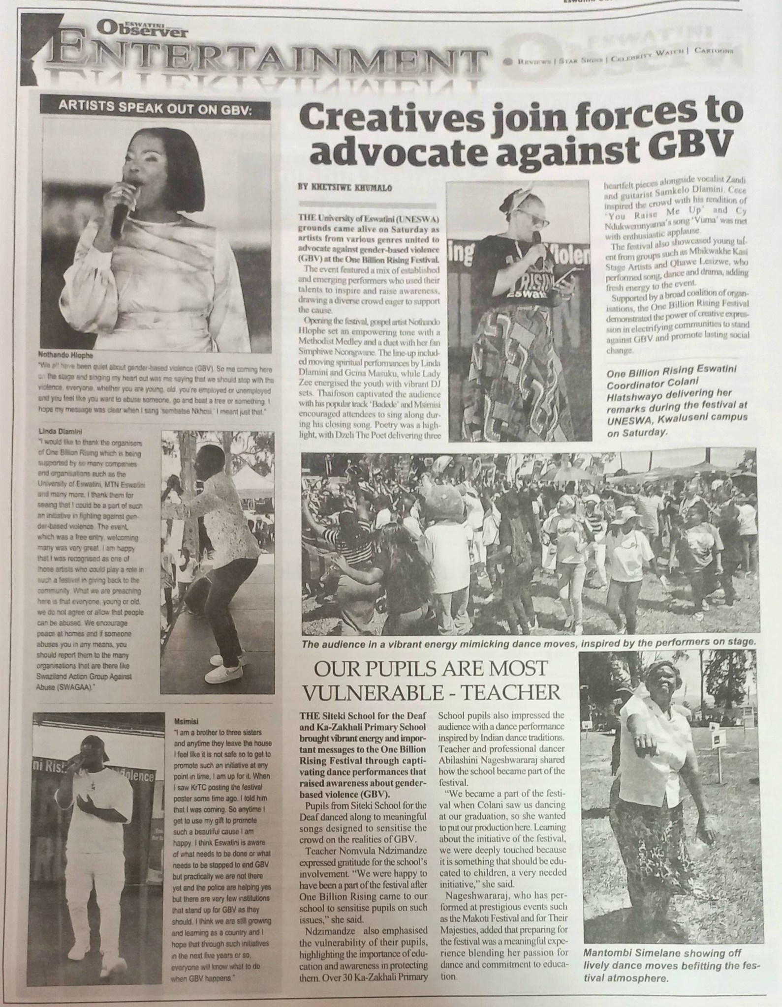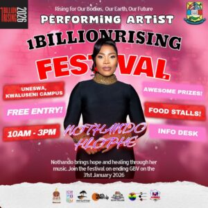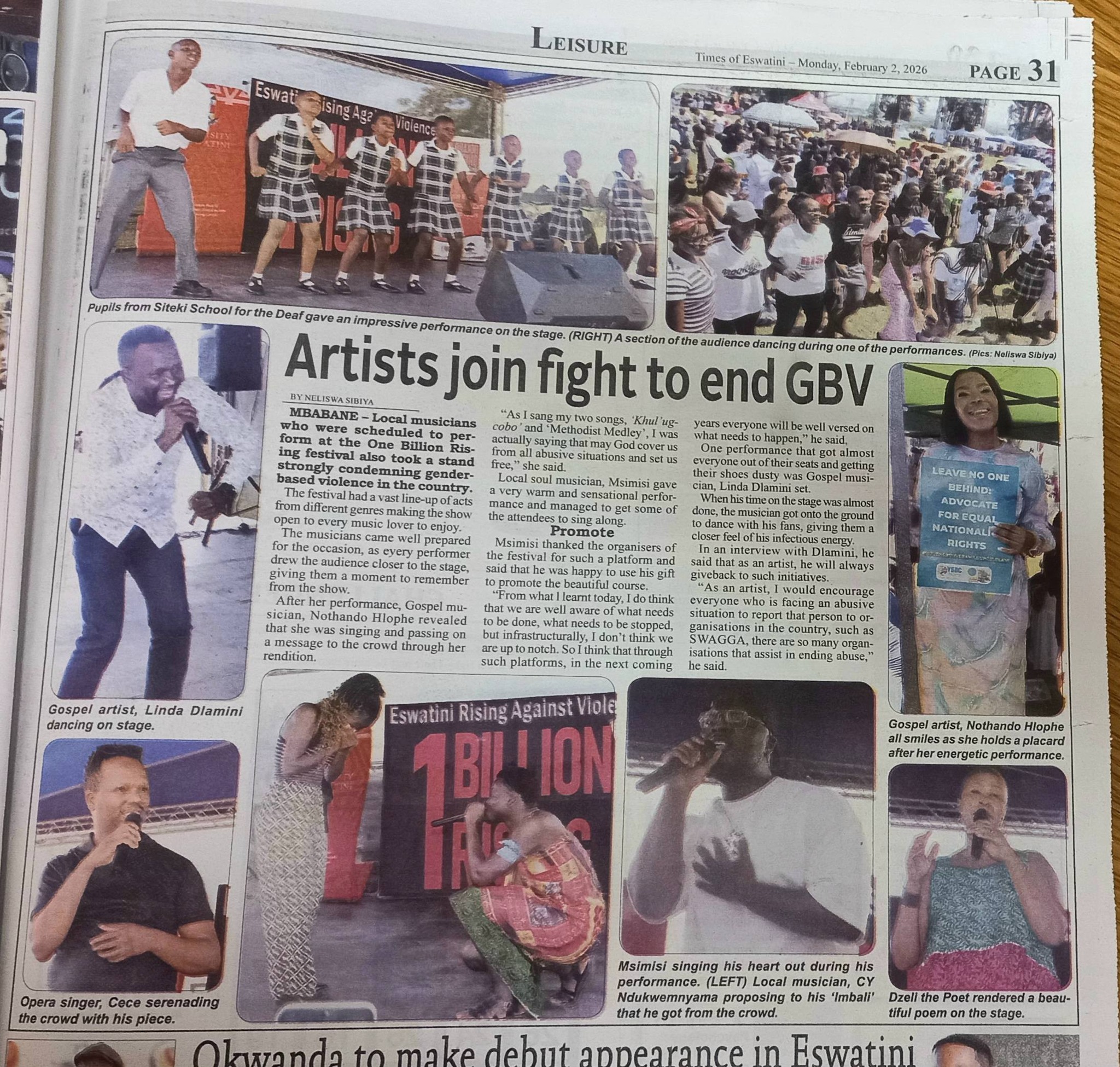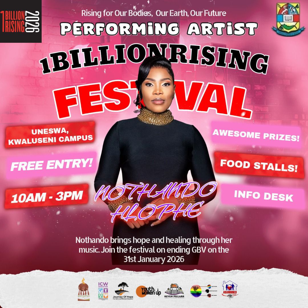 “One Billion Rising Eswatini 2026 Festival on ending Violence in Partnership with the University Of Eswatini and partners. Rising for Our Bodies, Our Earth, Our Future! Healing through music,dance. The laughter, joy, solidarity were a true reflection of the future we are rising for. A Jam-packed Artist line up for the One Billion Rising Eswatini Festival on Ending Violence. Artistis includes: Nothando Hlophe , Linda Dlamini, Thamsanqa Sibandze , Gcina Masuku & God Praisers ,@Msimisi, @DJ Lady Z, Dzeli The Poet , Thaifo Son, Mbikwakhe KASI Stage Artists, Kazakhali Private School performance. Powerful voices! One cause!