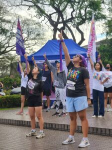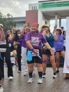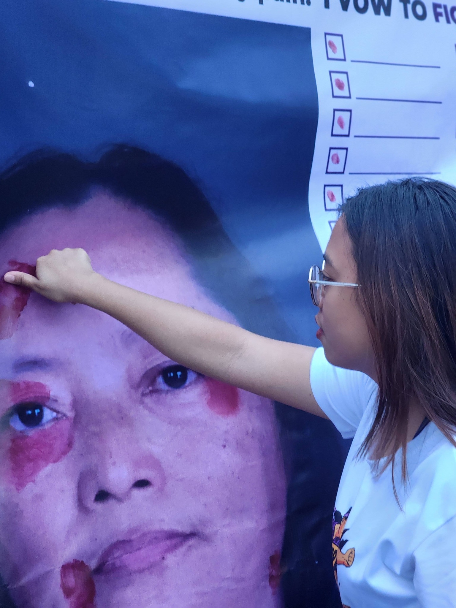 The program featured vibrant creative campaign and advocacy materials calling to “Defend Filipino Women,” “Labanan ang Abuso,” and “Kurakot, Managot!” A poignant highlight was the pledge activity “I Vow to Fight VAW: Your Touch Lessens My Pain.” Participants wiped off bruise marks on a large image of a woman—symbolizing collective healing from violence and abuse—and used the ink to imprint their thumbmark as a lasting commitment to end all forms of violence against women and girls.
