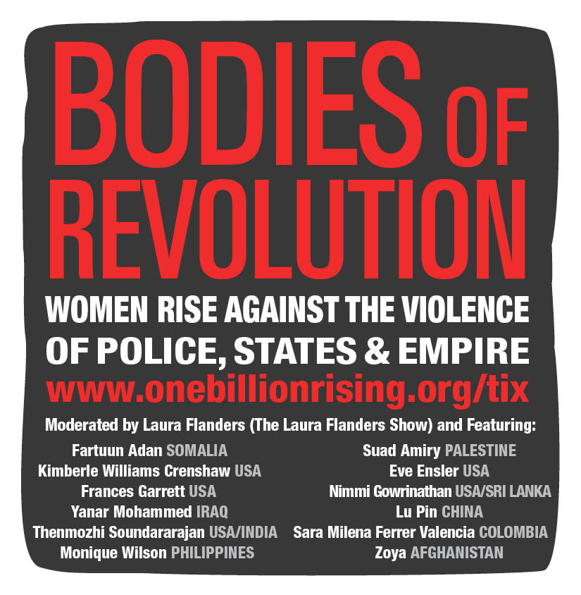 ONE BILLION RISING, AFRICAN AMERICAN POLICY FORUM, and the CENTER FOR INTERSECTIONALITY AND SOCIAL POLICY STUDIES (CISPS) AT COLUMBIA LAW SCHOOL presents: BODIES OF REVOLUTION: WOMEN RISE AGAINST THE VIOLENCE OF POLICE, STATES & EMPIRE Moderated by Laura Flanders (The Laura Flanders Show) and Featuring: Fartuun Adan SOMALIA Suad Amiry PALESTINE Kimberle Williams Crenshaw…