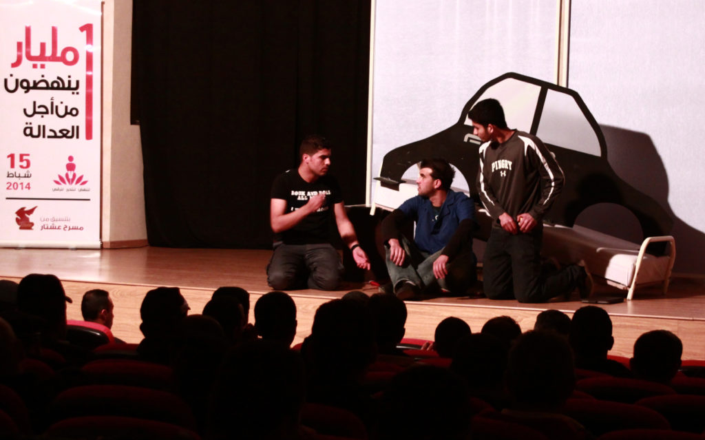 Today was the first day Palestine Rise at the Police Academy in Jericho with the Legislative play “Even at Home” that deals with the issues of Domestic Rape and ‘Honor’ Crimes. Following are the photos of the performance and the police interacting and a flyer in Arabic about the different events…