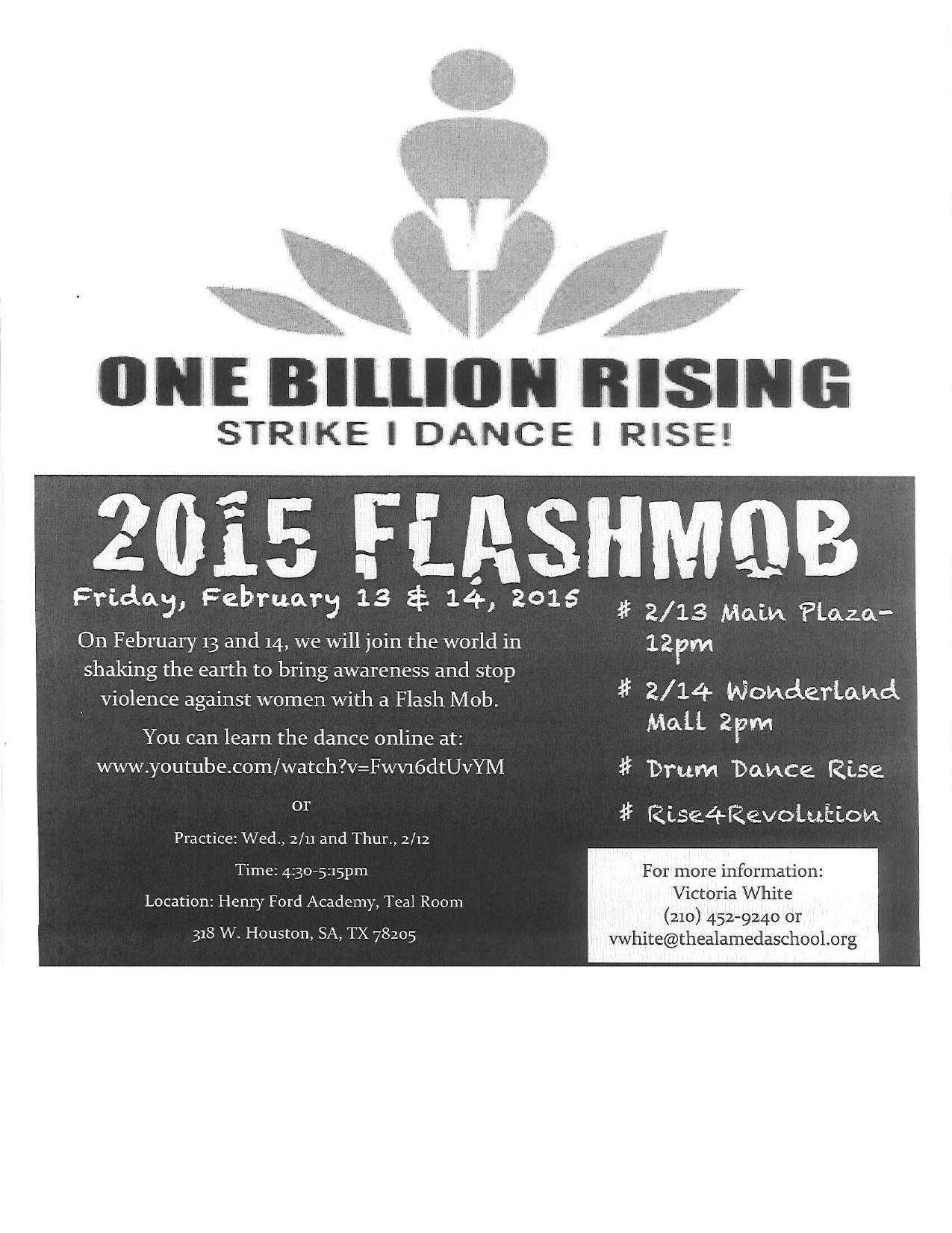 On February 13 and 14, we will join the world in shaking the earth to bring awareness and stop violence against women with a Flash Mob. You can learn the dance online at: www.youtube.com/watch?v=Fwv16dtUvYM For more information: Victoria White (210) 452-9240 or [email protected]