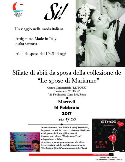 Dieci modelle, tra le quali le allieve del V AL del liceo Amaldi, da sempre con il nostro centro antiviolenza, parteciperanno alla sfilata de "Le spose di Marianne", che si terrà martedì 14 febbraio presso la profumeria Ethos del centro commerciale Le Torri di Tor Bella Monaca. Abbiamo deciso di sfilare il 14 febbraio, giorno di San Valentino e del One Billion Raising, la giornata in cui in tutto il mondo si balla e si canta contro la violenza di genere, che ancora conta un numero altissimo di morti, per cercare di mantenere sempre alta l'attenzione sul fenomeno, anche attraverso un evento apparentemente ludico, ma al quale, per la sua realizzazione, hanno operato molte utenti ed ex utenti della nostra struttura. Speriamo che la bellezza possa salvare il mondo, come diceva Dostoevskij. Noi, da parte nostra, ce la stiamo mettendo tutta, grazie a voi.