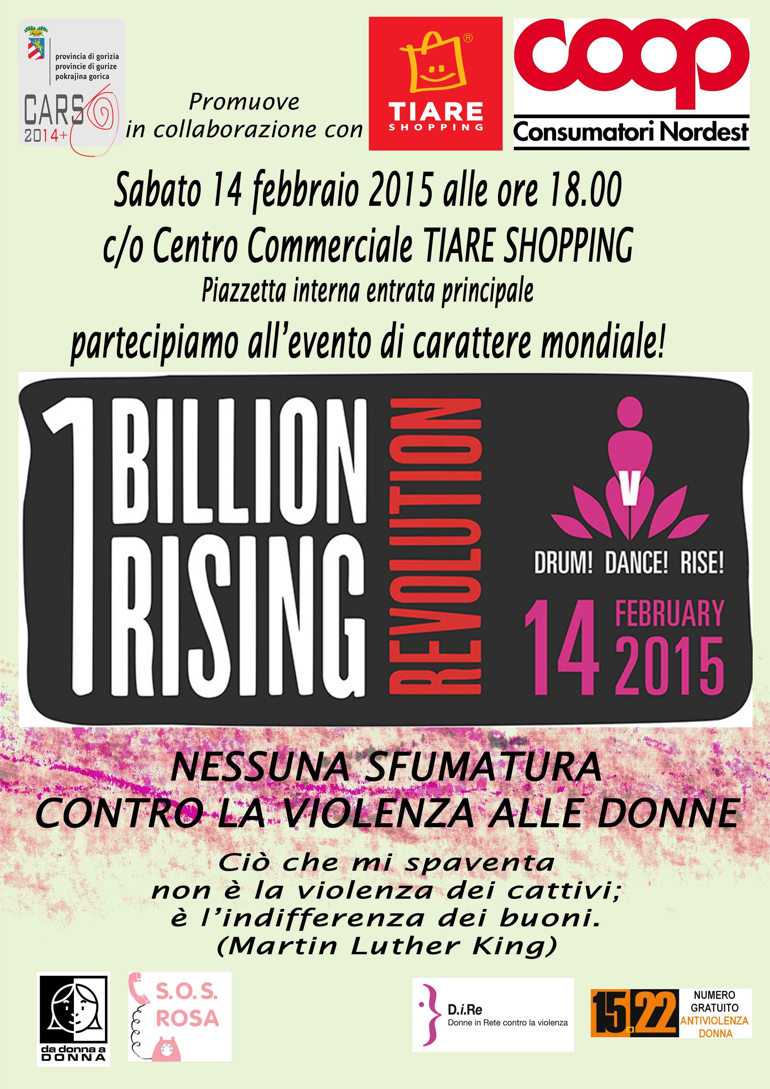The Department and the offices of Welfare and Equal Opportunities of the Province of Gorizia, together with the anti-violence centers Woman to Woman and SOS Rosa and with the participation ofuxilia NGO, the Provincial network against violence, the Tiare shopping and Coop Northwest Consumers also promote the territory isontino One Billion Rising: the appointment is expected to Mall shopping Tiare Villesse, in the inner square - main entrance, Saturday, 02.14.2015 at 18.00, where you will be offered a flash mob with the participation of dance schools Art Academy of Sagrado and Elever Cormons who will move to the tune of Break the chain. The project will be coordinated by journalist Alberto Zeppieri. Participate and numerous ballads !!!