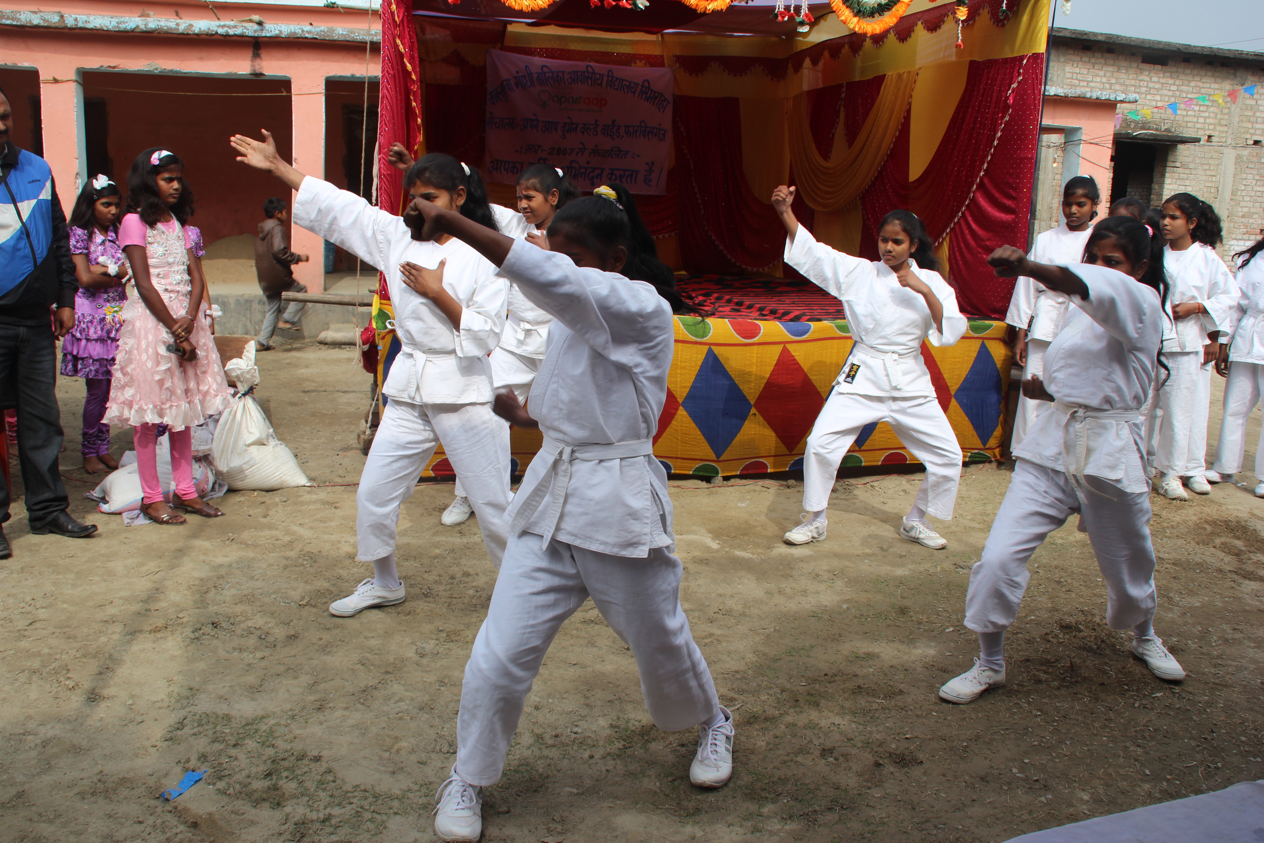 Girls from Apne Aap’s residential girl’s school in Bihar showcased their talents and shared their stories of personal growth for visiting iconic feminist Gloria Steinem and her Direct Donor Action group from New York. The school is set up through a Kasturba Gandhi Balika Vidyalaya (KGBV), a federal program introduced by the Indian government in 2004 to increase educational facilities for girls from lower castes. The girls performed a dance to Hindi music that they had choreographed themselves. This was followed by one of the girls narrating their different activities at the school and describing the impact that being part of a residential school has had on her life and aspirations. The girls also did a demonstration of the Karate that they learn at KGBV; the karate classes have helped to instill in the girls a sense of confidence in their ability to defend themselves and define their own limits. The program ended with Gloria Steinem and Ruchira Gupta addressing the gathering of the girls and teachers along with other local people who had gathered there to watch the program. Gloria was nostalgic in speaking of her past visit to KGBV. She narrated her personal childhood experience with dance, which she believed was an important form of freedom for girls. Ruchira Gupta spoke of the hurdles that AAWW faced in setting up the residential school in 2007. The program ended with a vote of thanks and the girls cheerfully bidding goodbye to the guests.