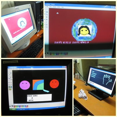A group of 25 children ranging from 10-15 years participated in a workshop hosted at the Apne Aap center in Kolkata on envisioning a violence-free future. This workshop was important because children in these communities have unfortunately been subjected to seeing a lot of violence in their families while growing up. All the children were made to sit in a circle and were shown pictures on abuse. They were then asked what they felt when they saw each picture. Then they were encouraged to talk to each other to understand each others’ points of view and to work on developing respect towards individuals of the opposite sex. For example, a child named Vivek, who has seen a lot of violence at home, expressed that he accepted that as a way of life, whereas another student, Pooja, who was given a lot of freedom at home, spoke about the importance of standing up for oneself. The children were then instructed on how to make E – Drawings depicting their own views on the matter. The E-drawing activity gave them an opportunity to practice their computer skills, build confidence in their ability to express themselves, process all of the ideas they had discussed, and envision a brighter future for themselves and their peers.
