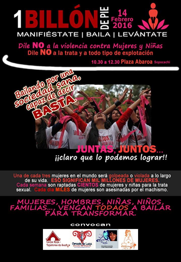 Apoyando el movimiento global UN BILLÓN DE PIE, **BAILAMOS** para: 1) Generar energía de empoderamiento para las mujeres que estén en situación de abuso, y así también para sus hijas e hijos. 2) Hacerles saber que no están solas. 3) Llamar la atención de la sociedad, informarl@s y motivarl@s a sumarse a la voz colectiva que dice BASTA.