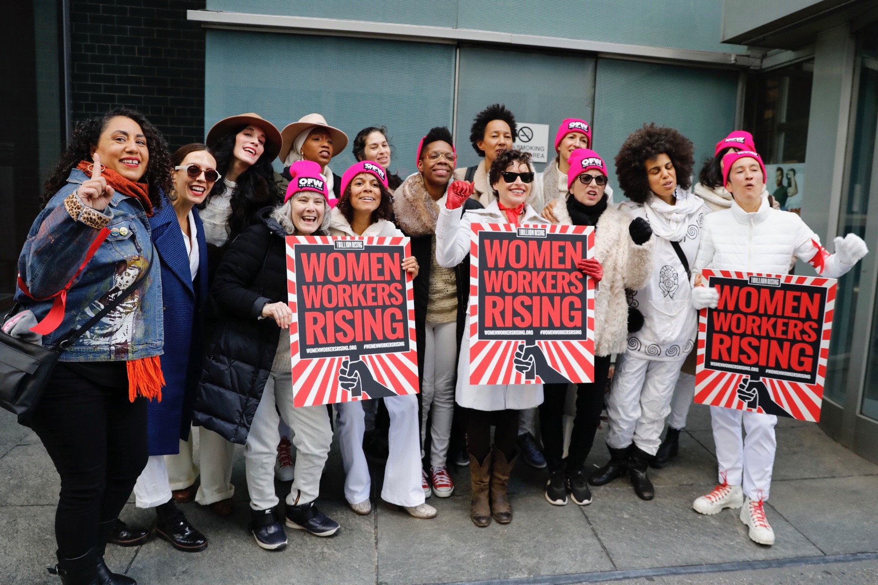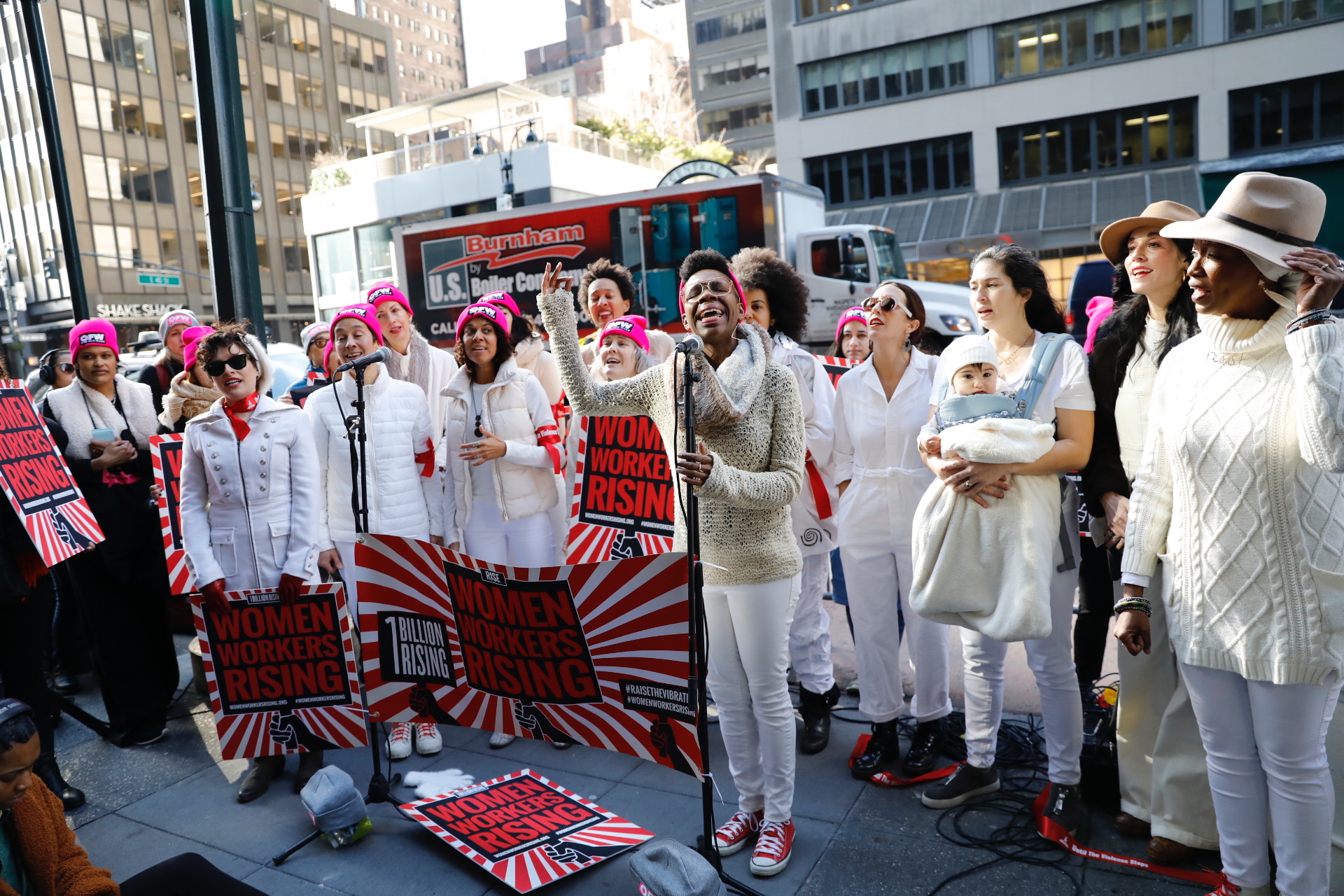 Resistance Revival Chorus at Women Workers Rising” in NYC. Women restaurant workers & allies call on Governor Cuomo to include restaurants in $15 minimum wage. One Fair Wage, One Billion Rising and 25+ other groups staged public self-defense training action and delivered letter to Governor’s New York City office today.