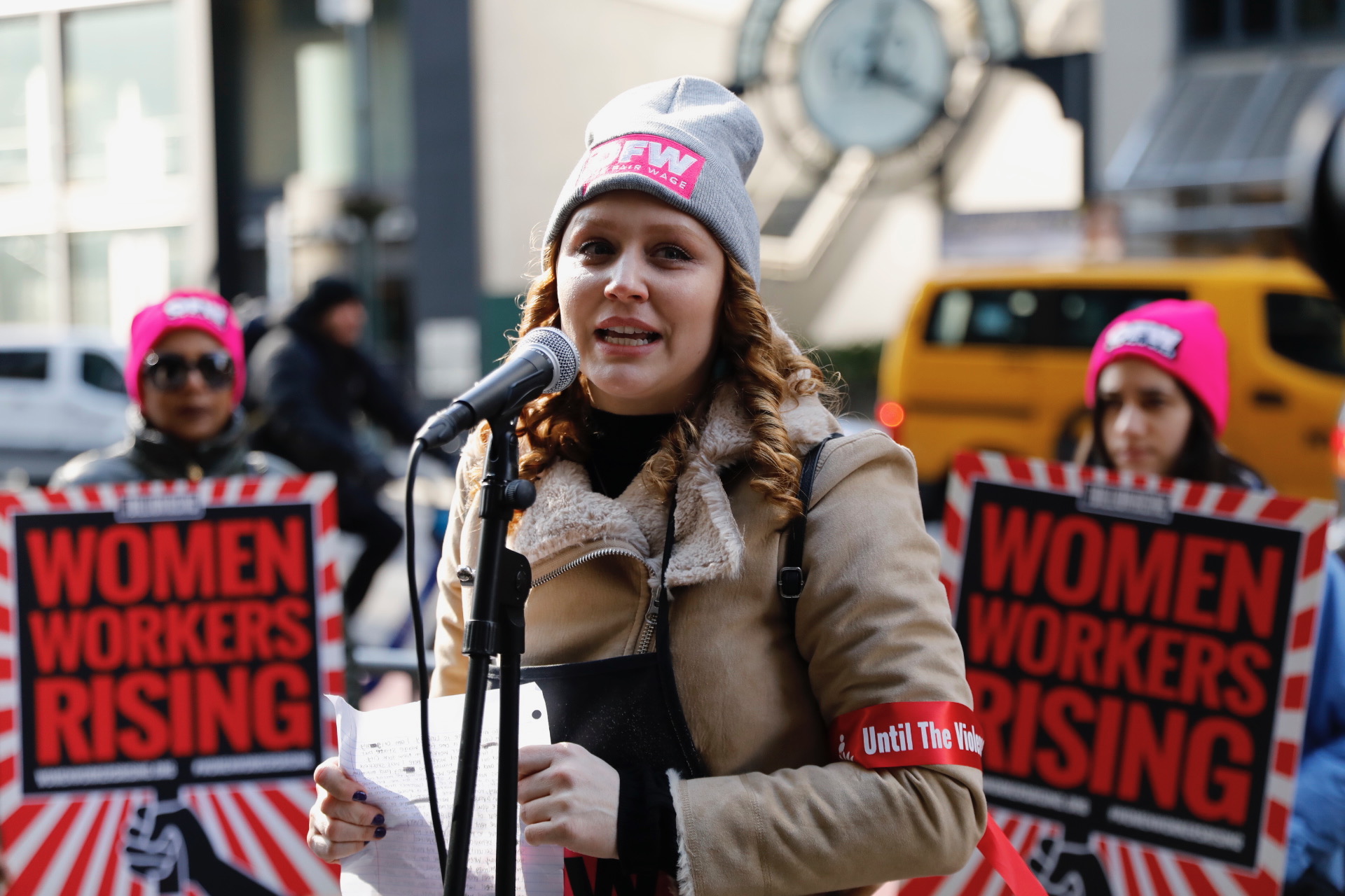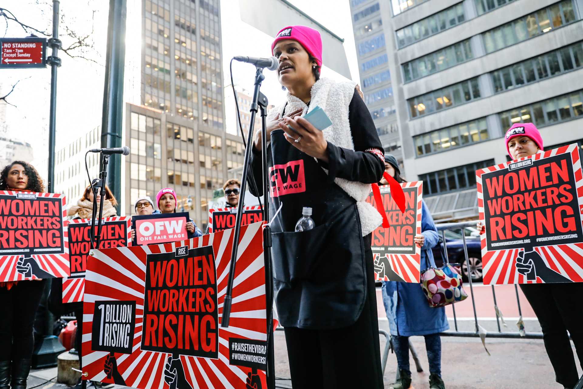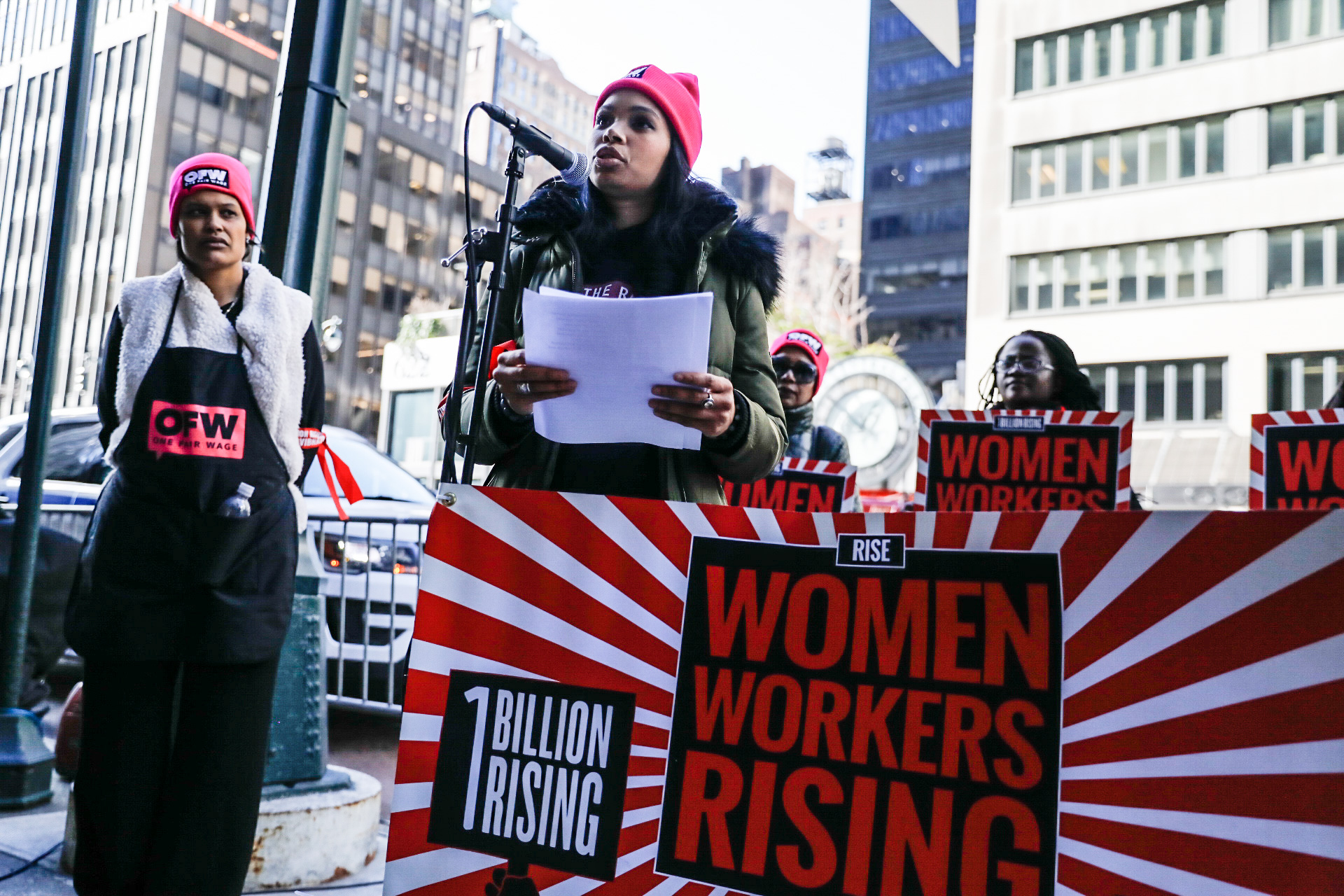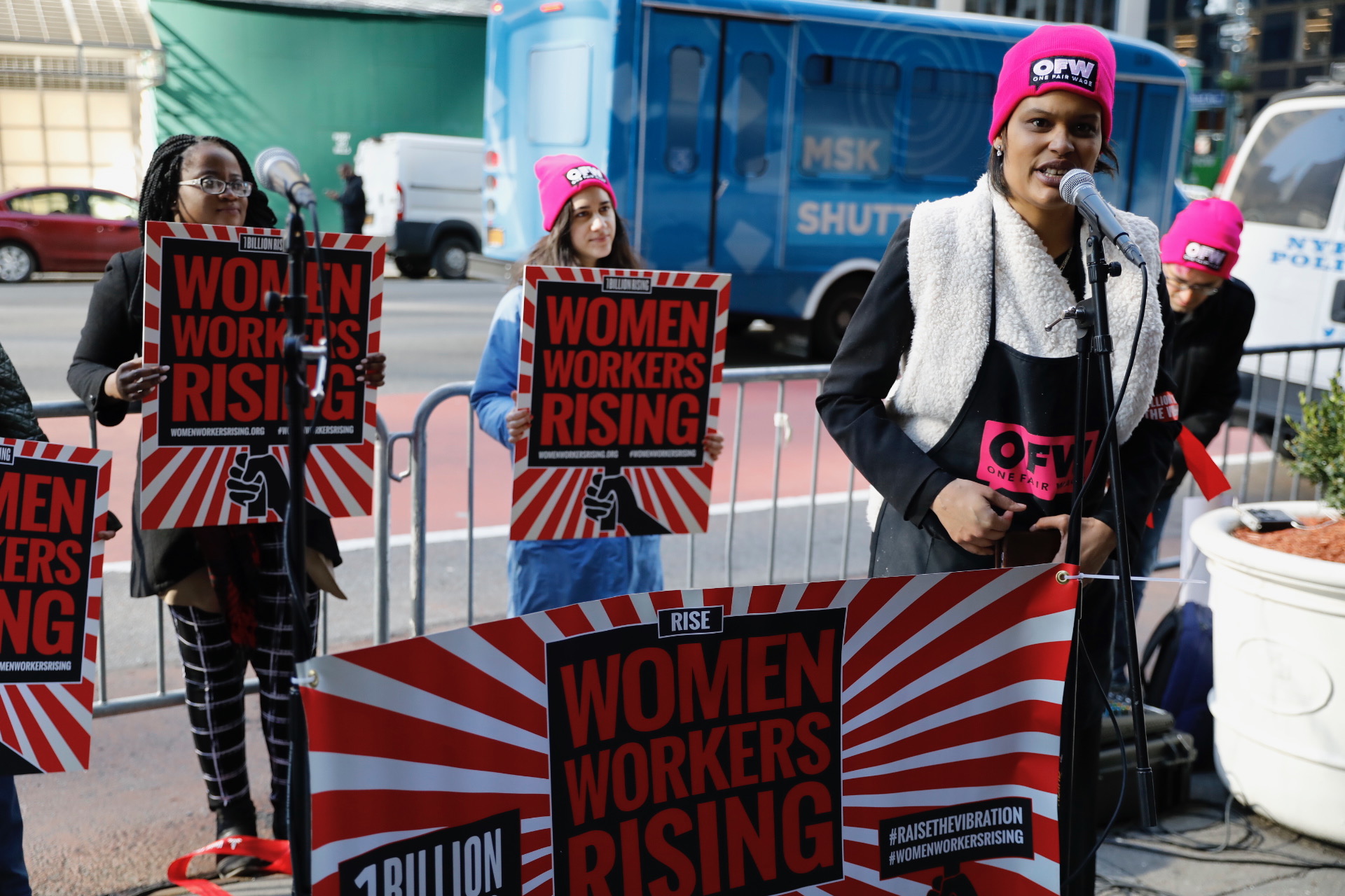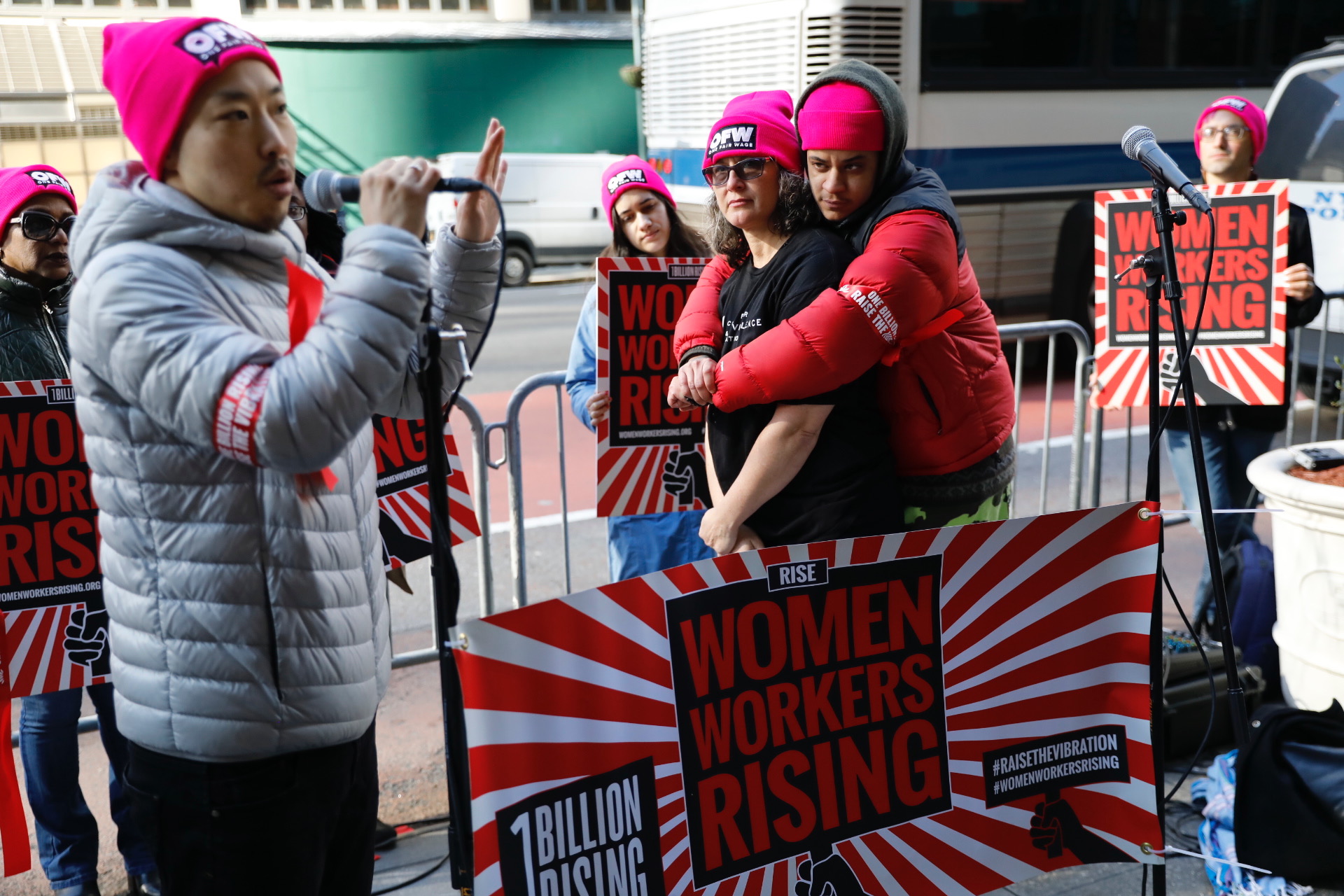 Restaurant worker Lindsay Brownstein speaks at “Women Workers Rising”. Women restaurant workers & allies call on Governor Cuomo to include restaurants in $15 minimum wage. One Fair Wage, One Billion Rising and 25+ other groups staged public self-defense training action and delivered letter to Governor’s New York City office today.