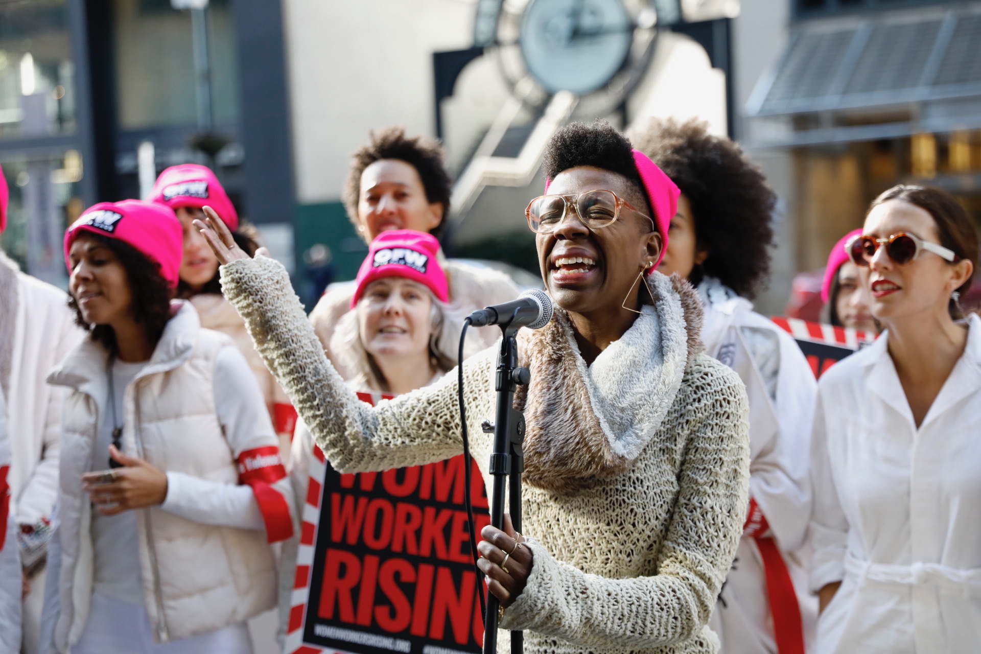Taina Asili performs “We Are Rising” at “Women Workers Rising”. Women restaurant workers & allies call on Governor Cuomo to include restaurants in $15 minimum wage. One Fair Wage, One Billion Rising and 25+ other groups staged public self-defense training action and delivered letter to Governor’s New York City office today.