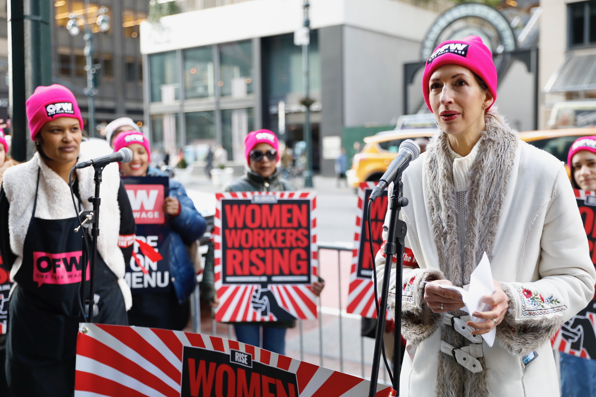 Alysia Reiner speaks at “Women Workers Rising”. Women restaurant workers & allies call on Governor Cuomo to include restaurants in $15 minimum wage. One Fair Wage, One Billion Rising and 25+ other groups staged public self-defense training action and delivered letter to Governor’s New York City office today.