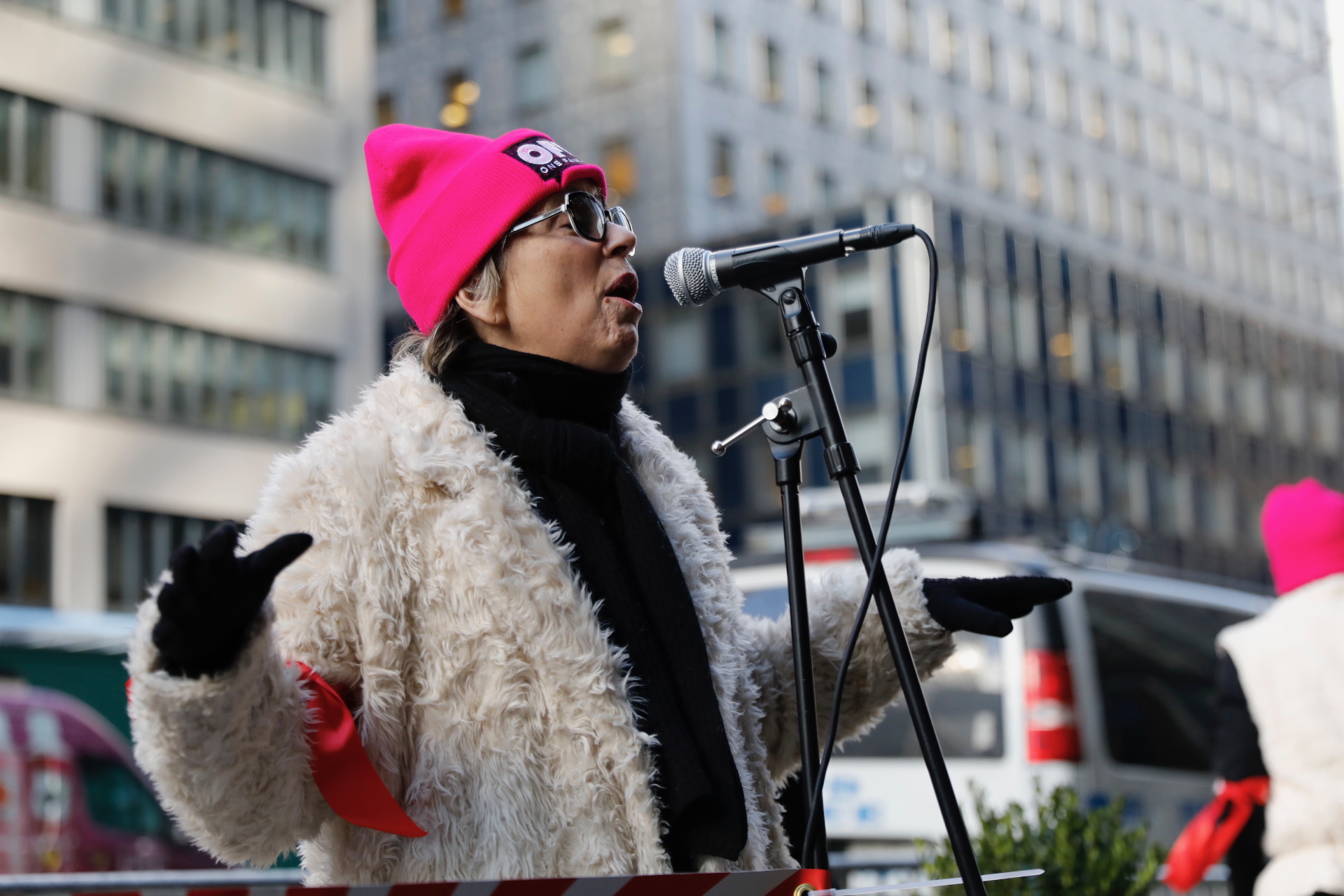 Taina Asili, Resistance Revival Chorus, V (formerly Eve Ensler) at “Women Workers Rising”. Women restaurant workers & allies call on Governor Cuomo to include restaurants in $15 minimum wage. One Fair Wage, One Billion Rising and 25+ other groups staged public self-defense training action and delivered letter to Governor’s New York City office today.