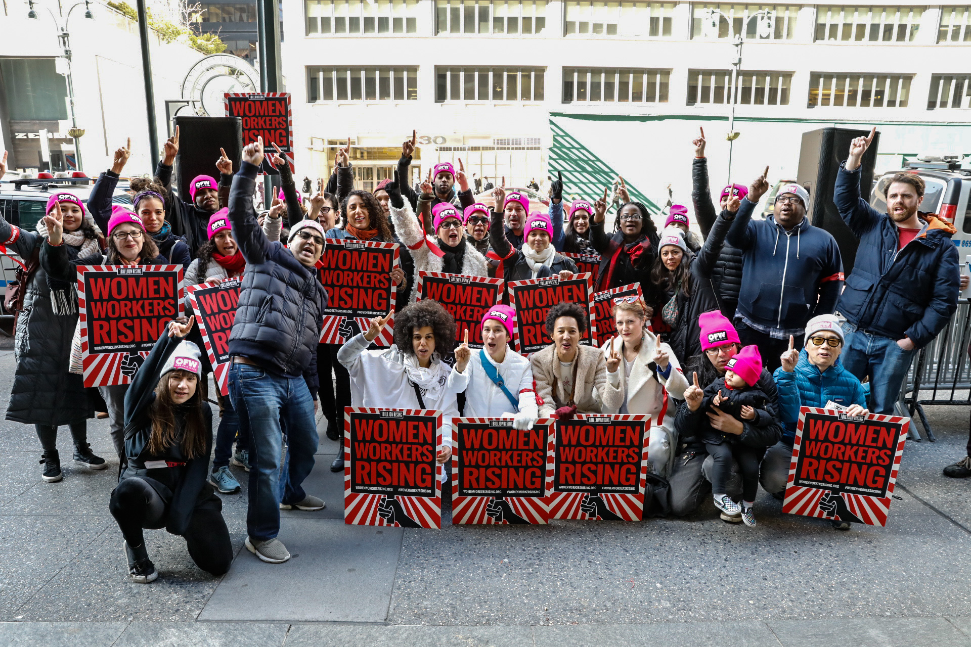 Women Workers Rising” activists gather. as Women restaurant workers & allies call on Governor Cuomo to include restaurants in $15 minimum wage. One Fair Wage, One Billion Rising and 25+ other groups staged public self-defense training action and delivered letter to Governor’s New York City office today.